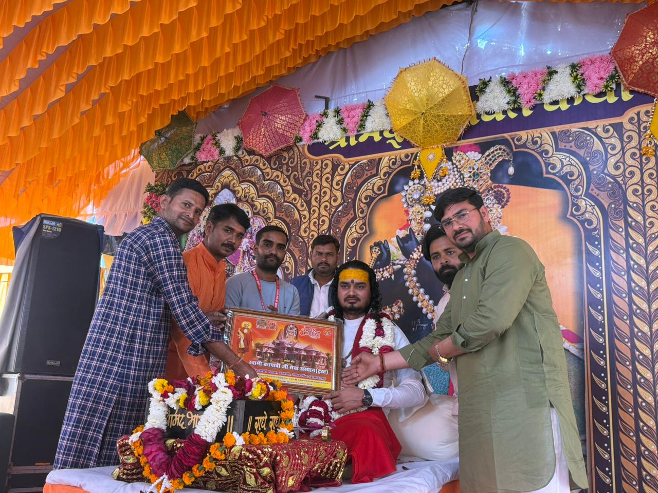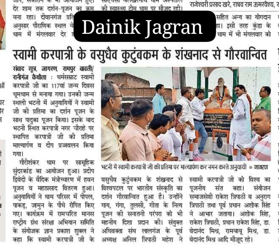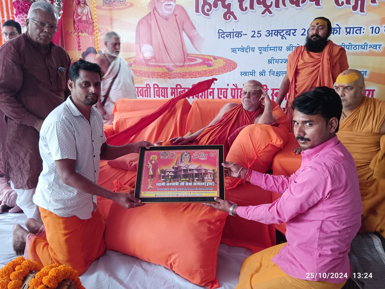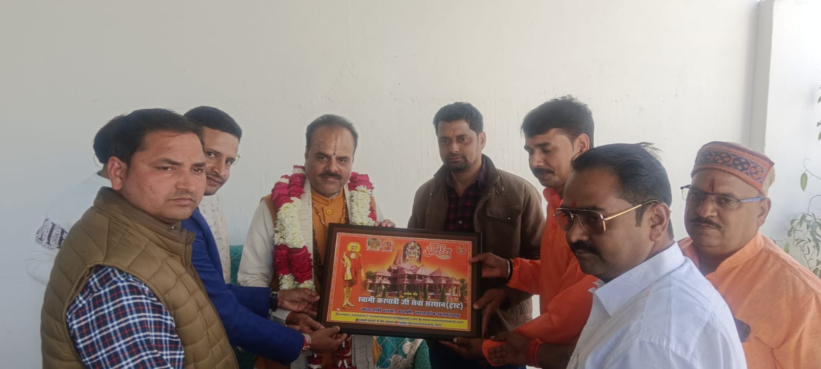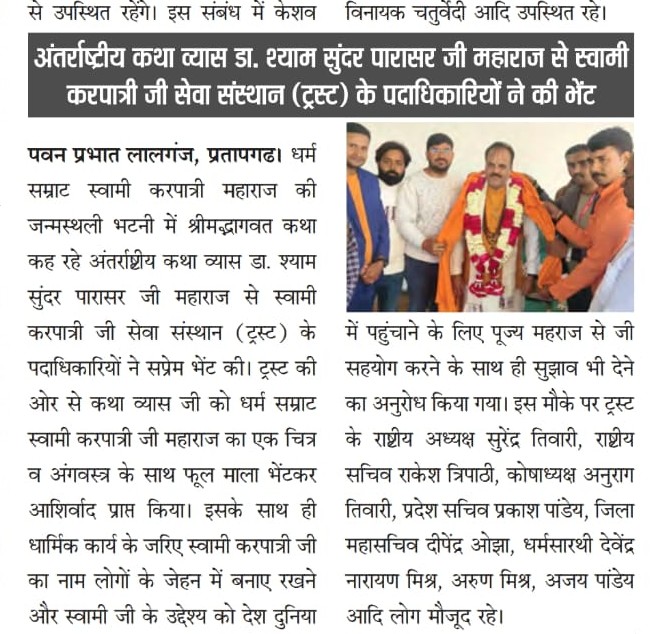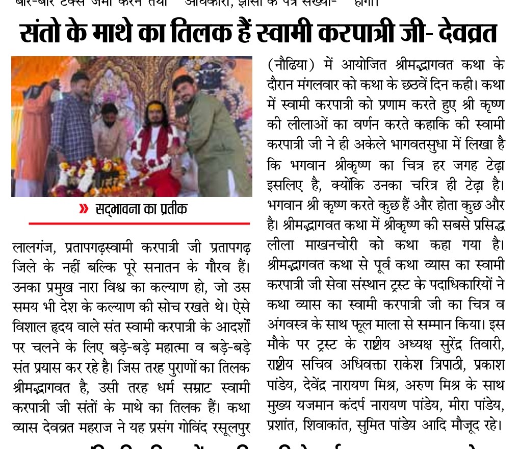 17 फरवरी 2026 को भागवत भूषण श्री देवव्रत जी महाराज को नौढिया कुंडा, प्रतापगढ़ में श्रीमद्भागवत कथा के दौरान स्वामी करपात्री जी का चित्र व अंगवस्त्र भेंट किया गया