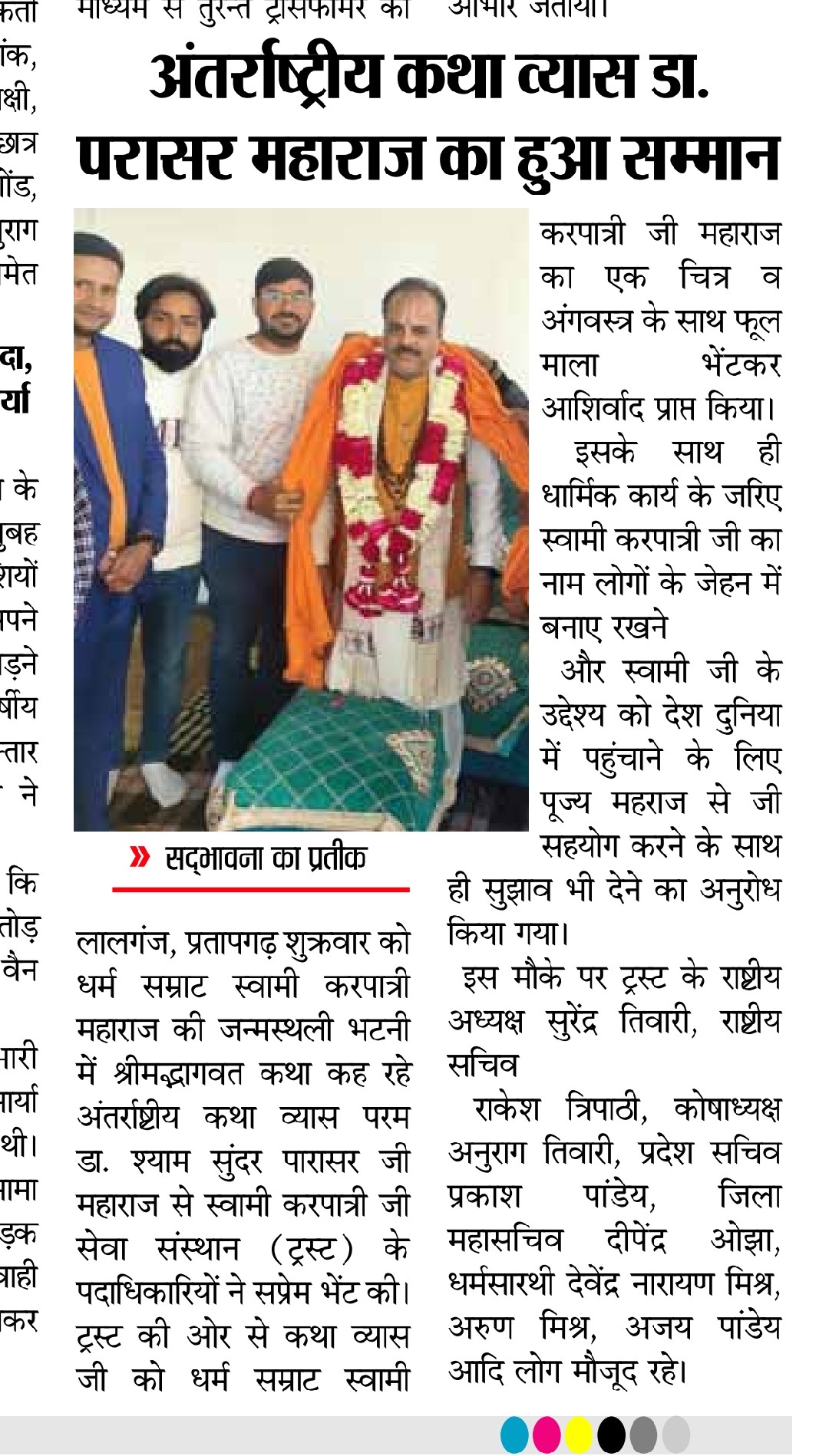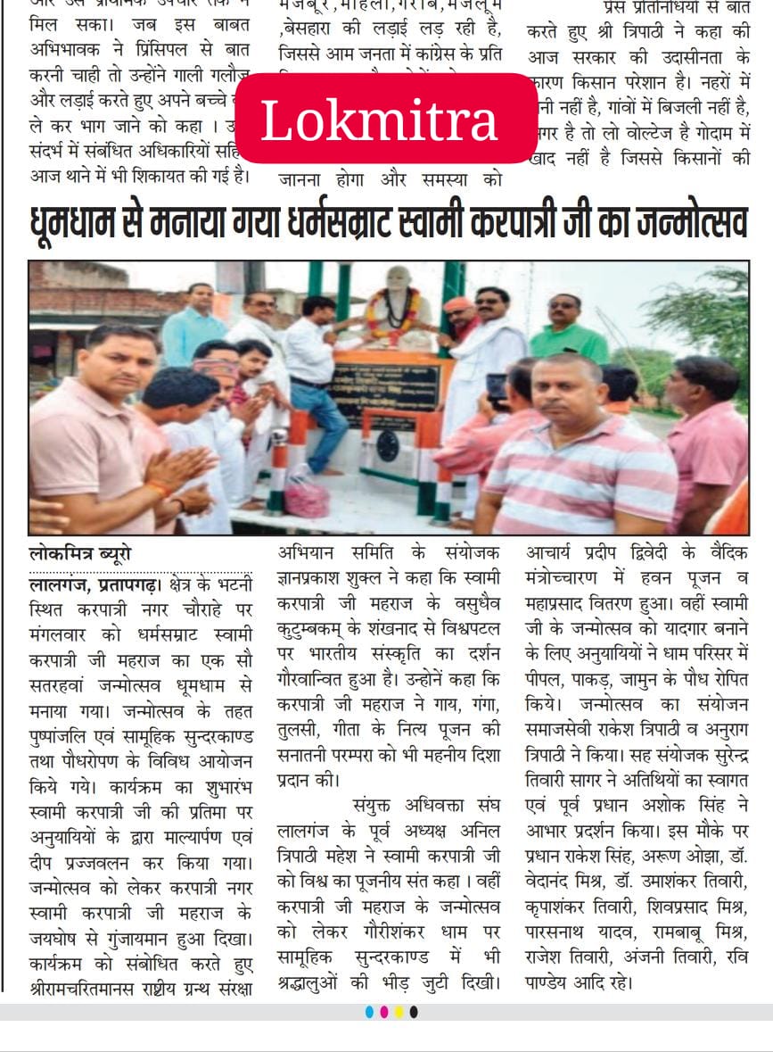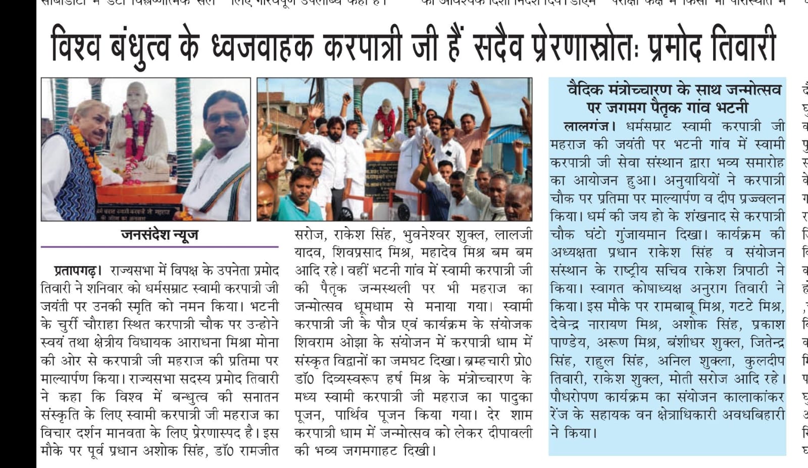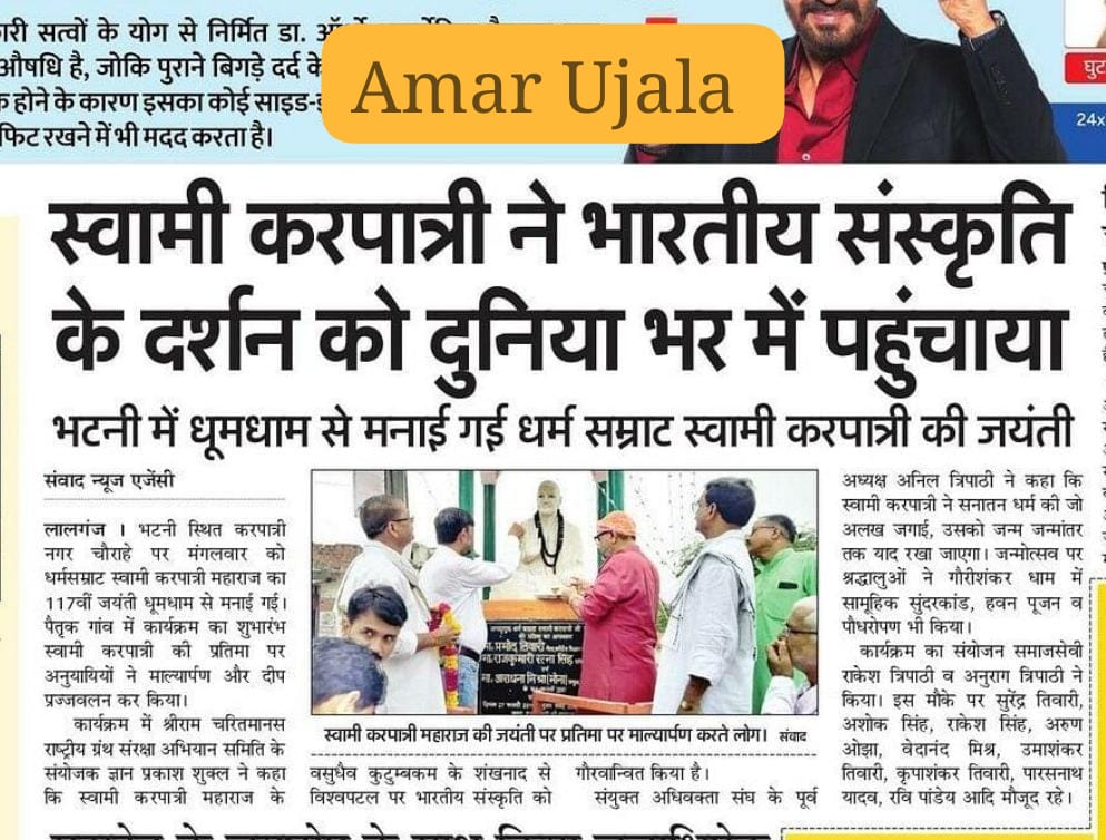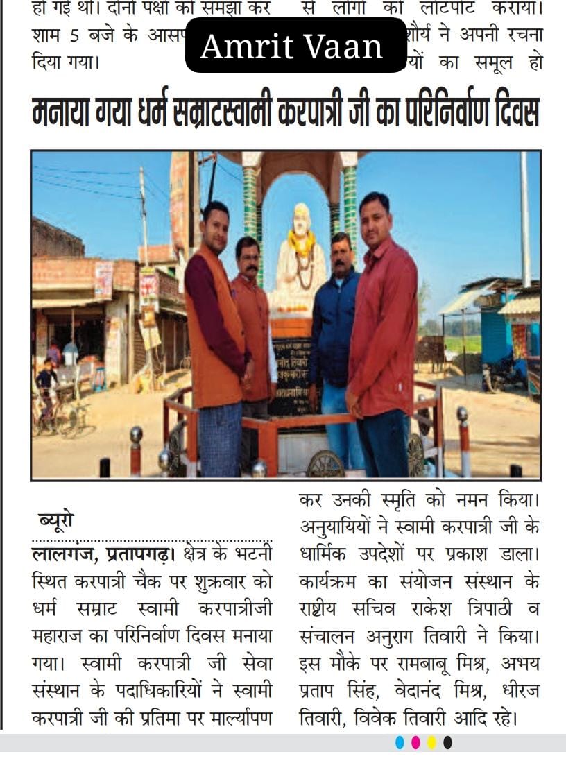 17 फरवरी 2026 को भागवत भूषण श्री देवव्रत जी महाराज को नौढिया कुंडा, प्रतापगढ़ में श्रीमद्भागवत कथा के दौरान स्वामी करपात्री जी का चित्र व अंगवस्त्र भेंट किया गया