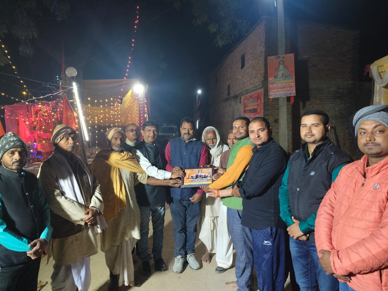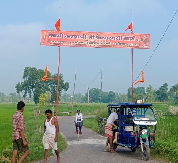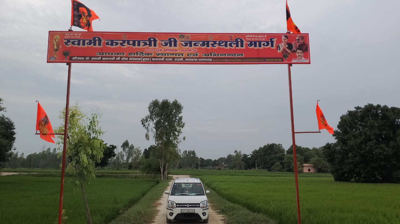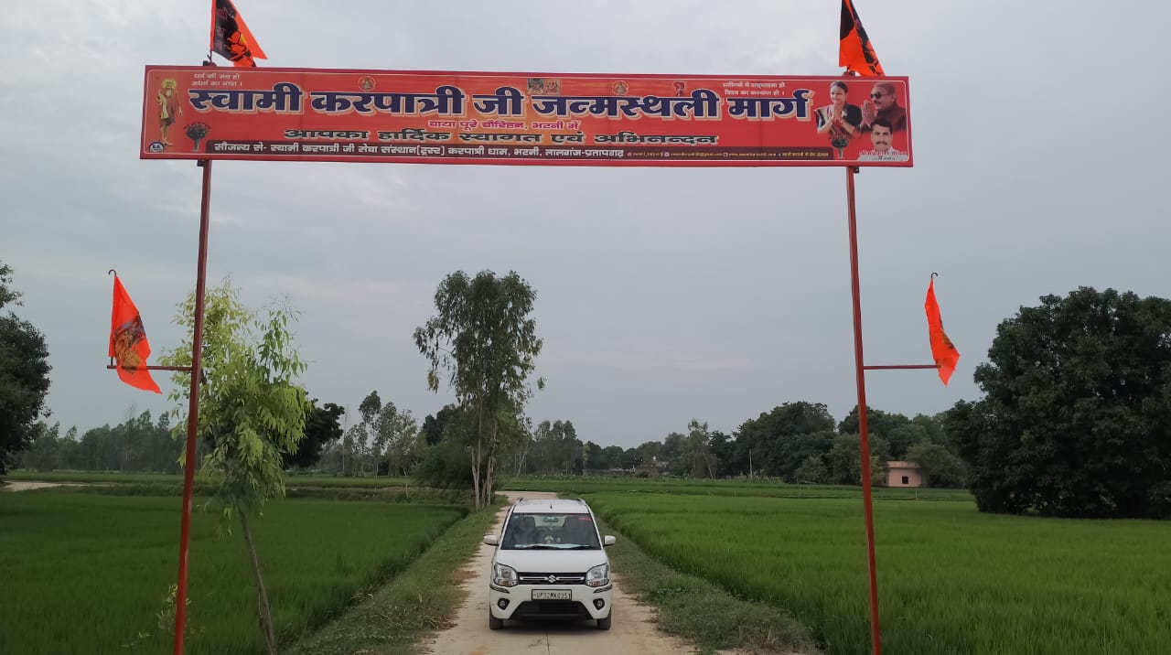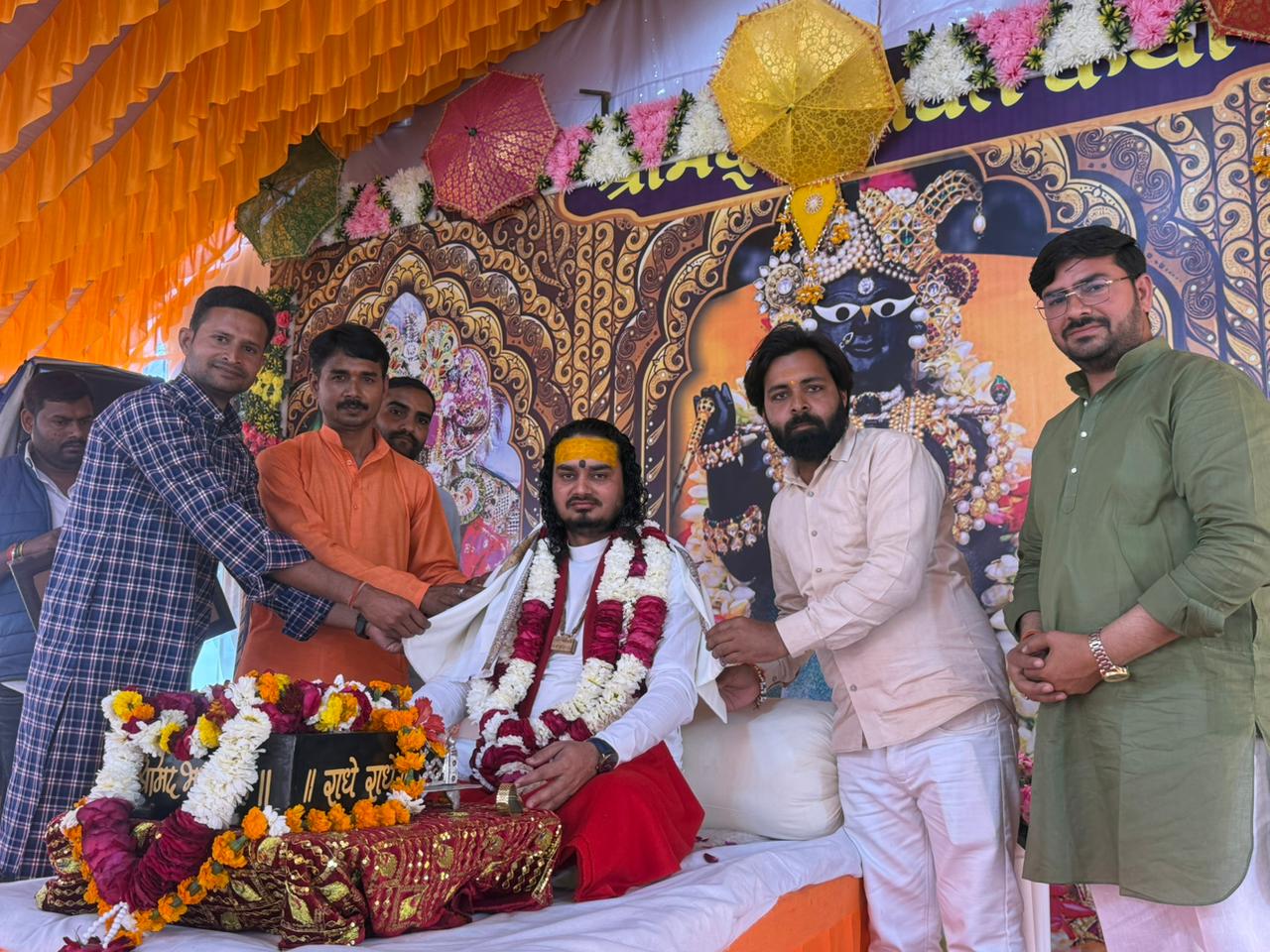 17 फरवरी 2026 को भागवत भूषण श्री देवव्रत जी महाराज को नौढिया कुंडा, प्रतापगढ़ में श्रीमद्भागवत कथा के दौरान स्वामी करपात्री जी का चित्र व अंगवस्त्र भेंट किया गया