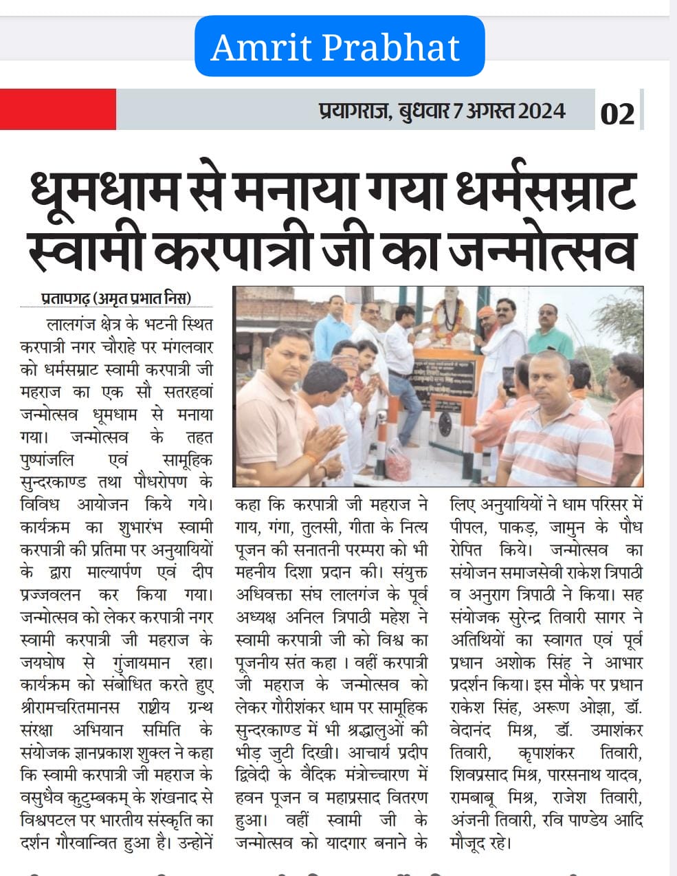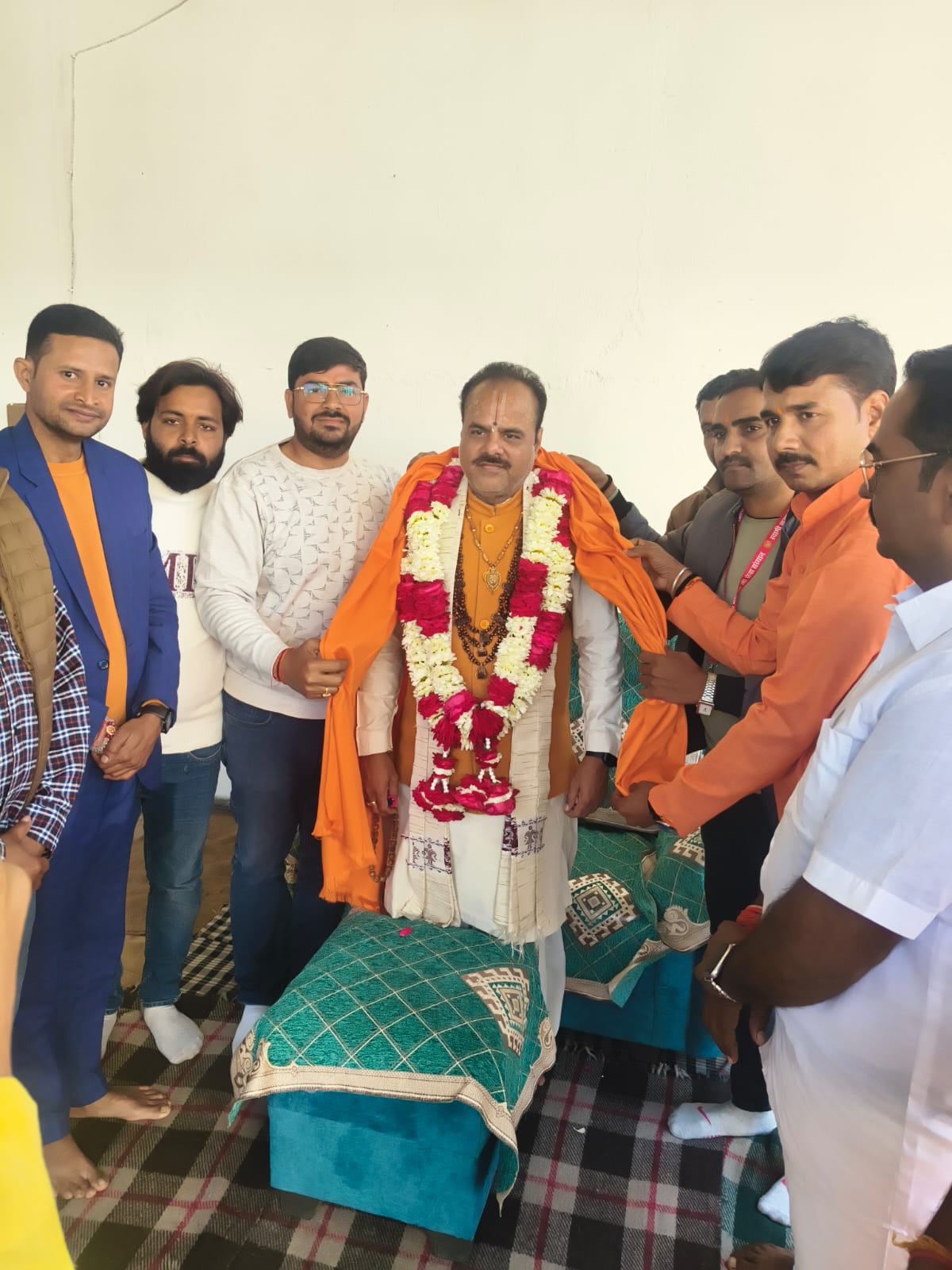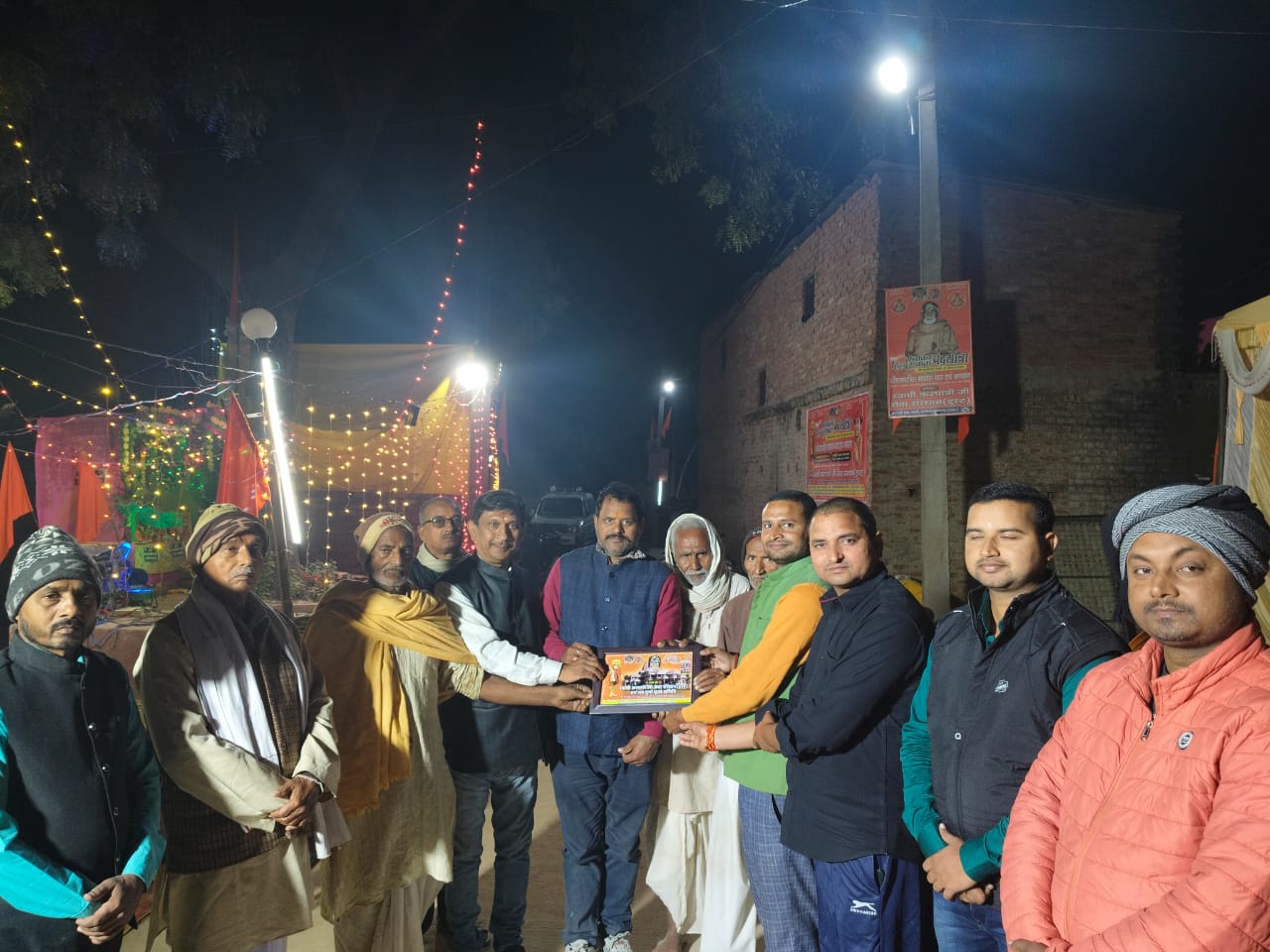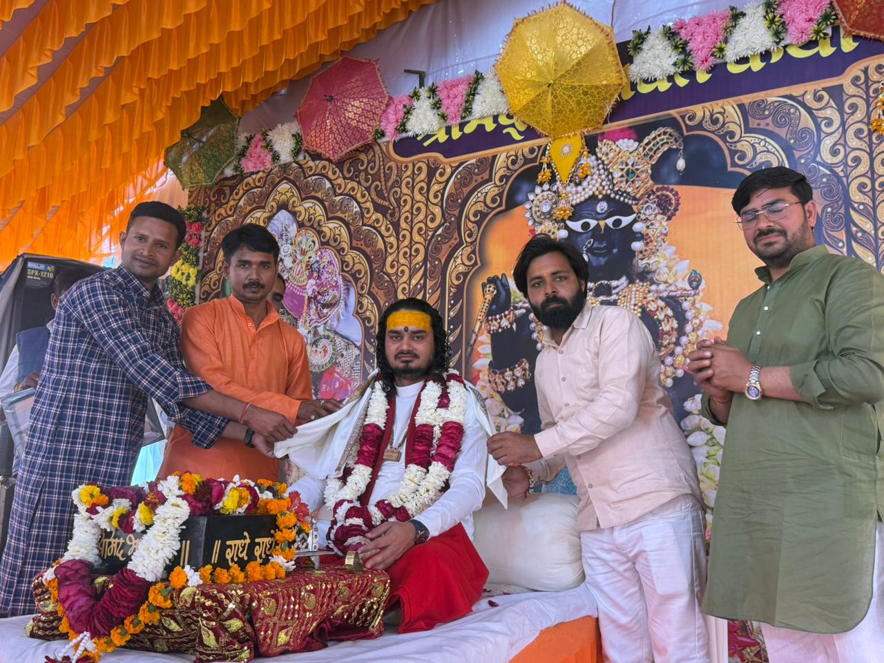 17 फरवरी 2026 को भागवत भूषण श्री देवव्रत जी महाराज को नौढिया कुंडा, प्रतापगढ़ में श्रीमद्भागवत कथा के दौरान स्वामी करपात्री जी का चित्र व अंगवस्त्र भेंट किया गया