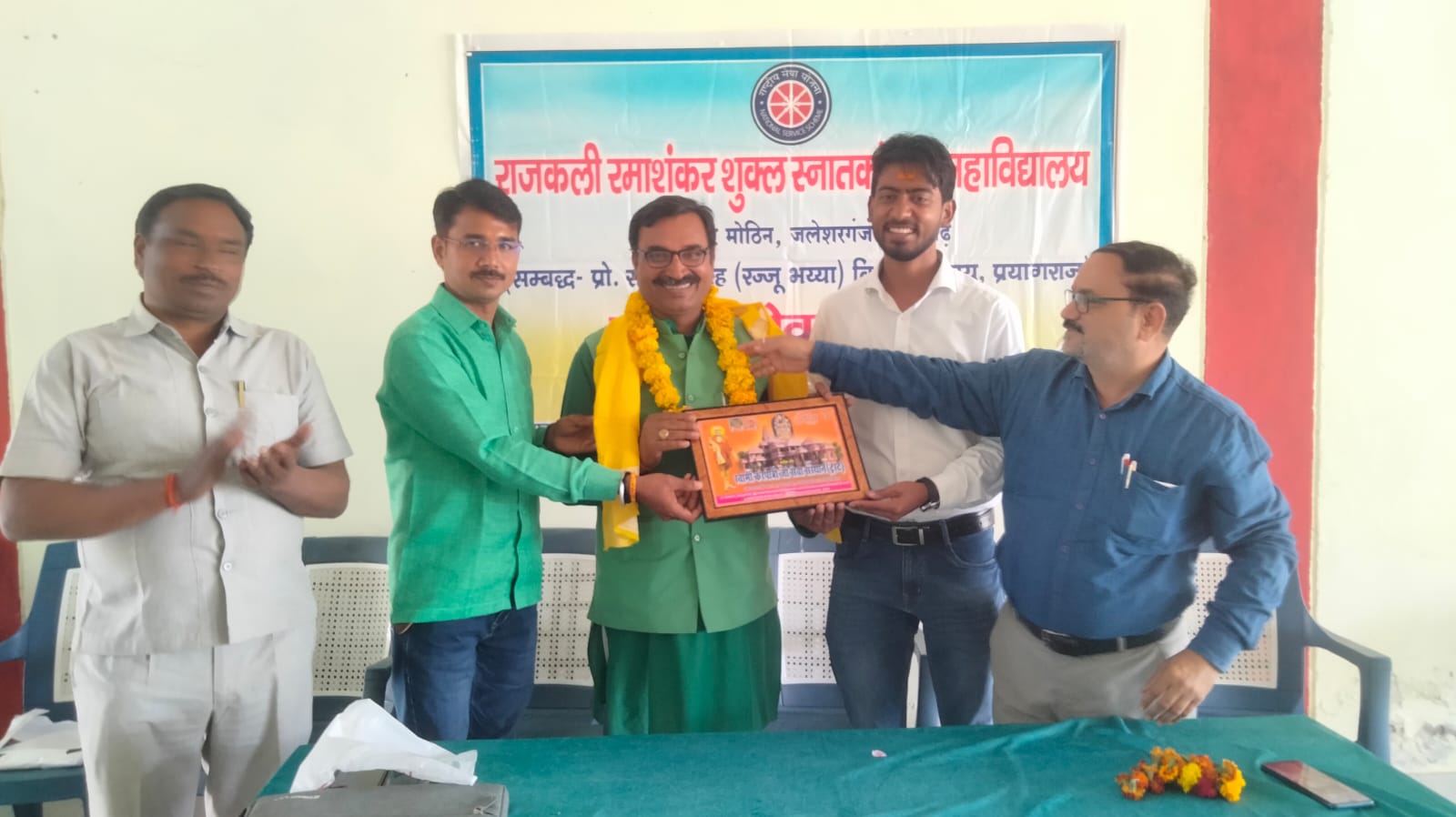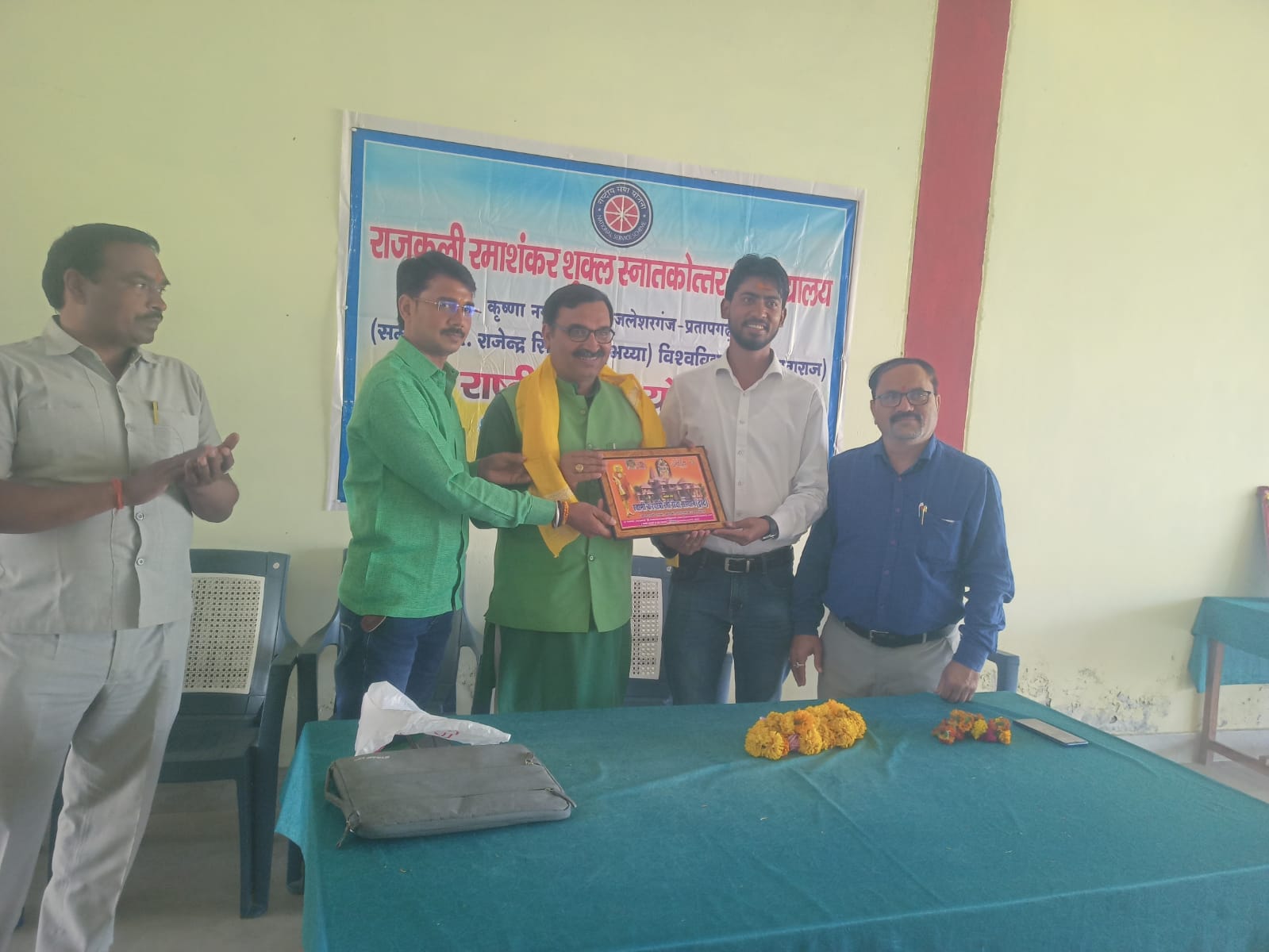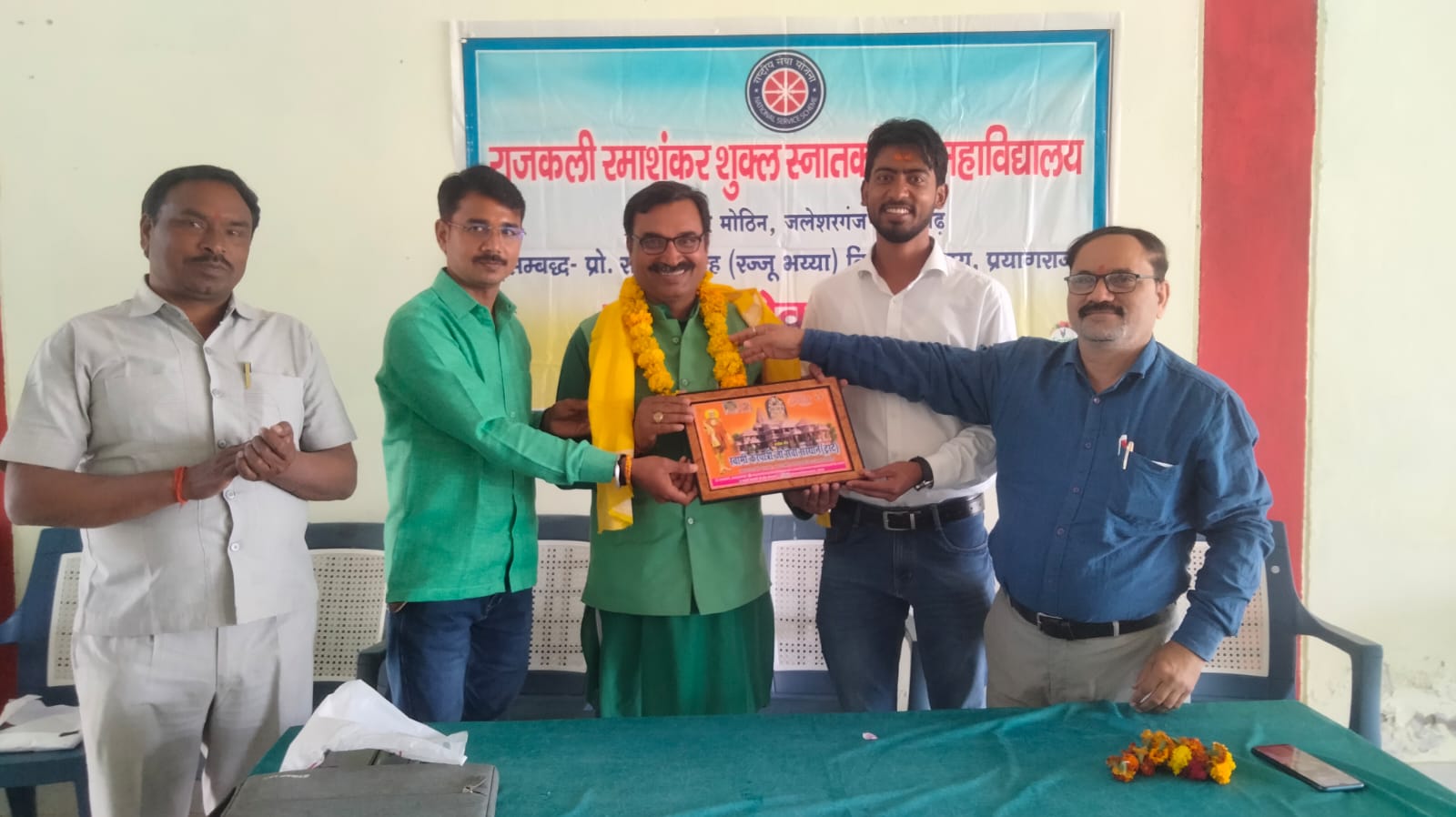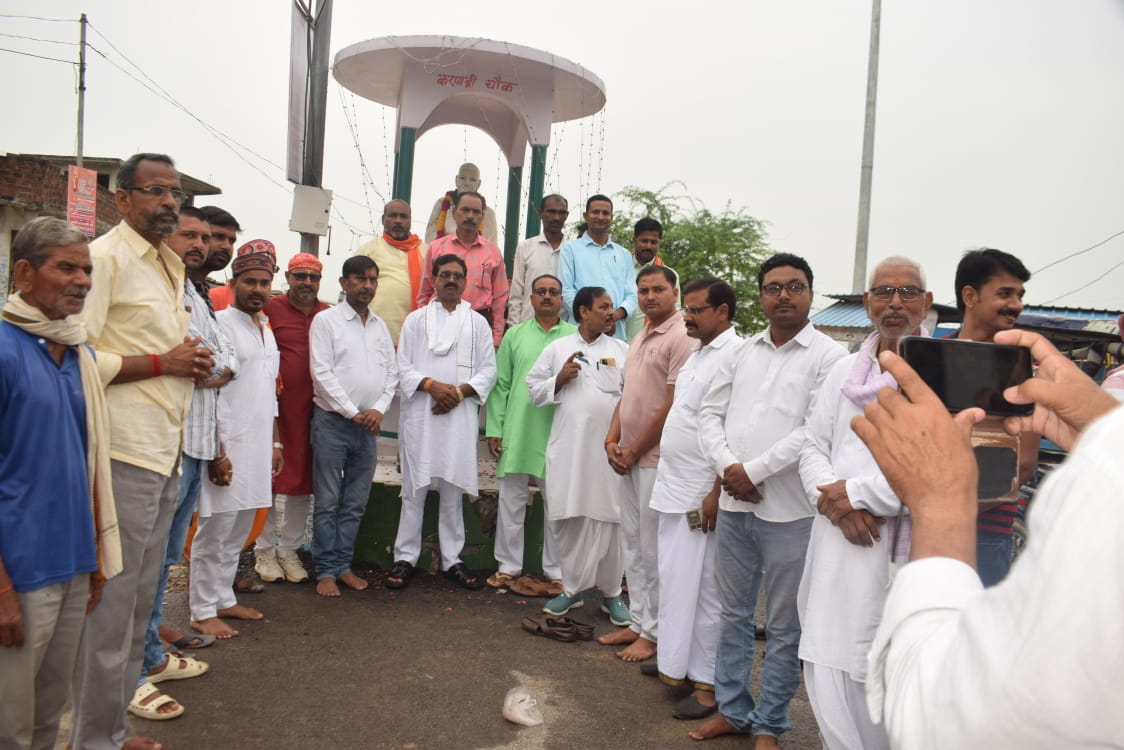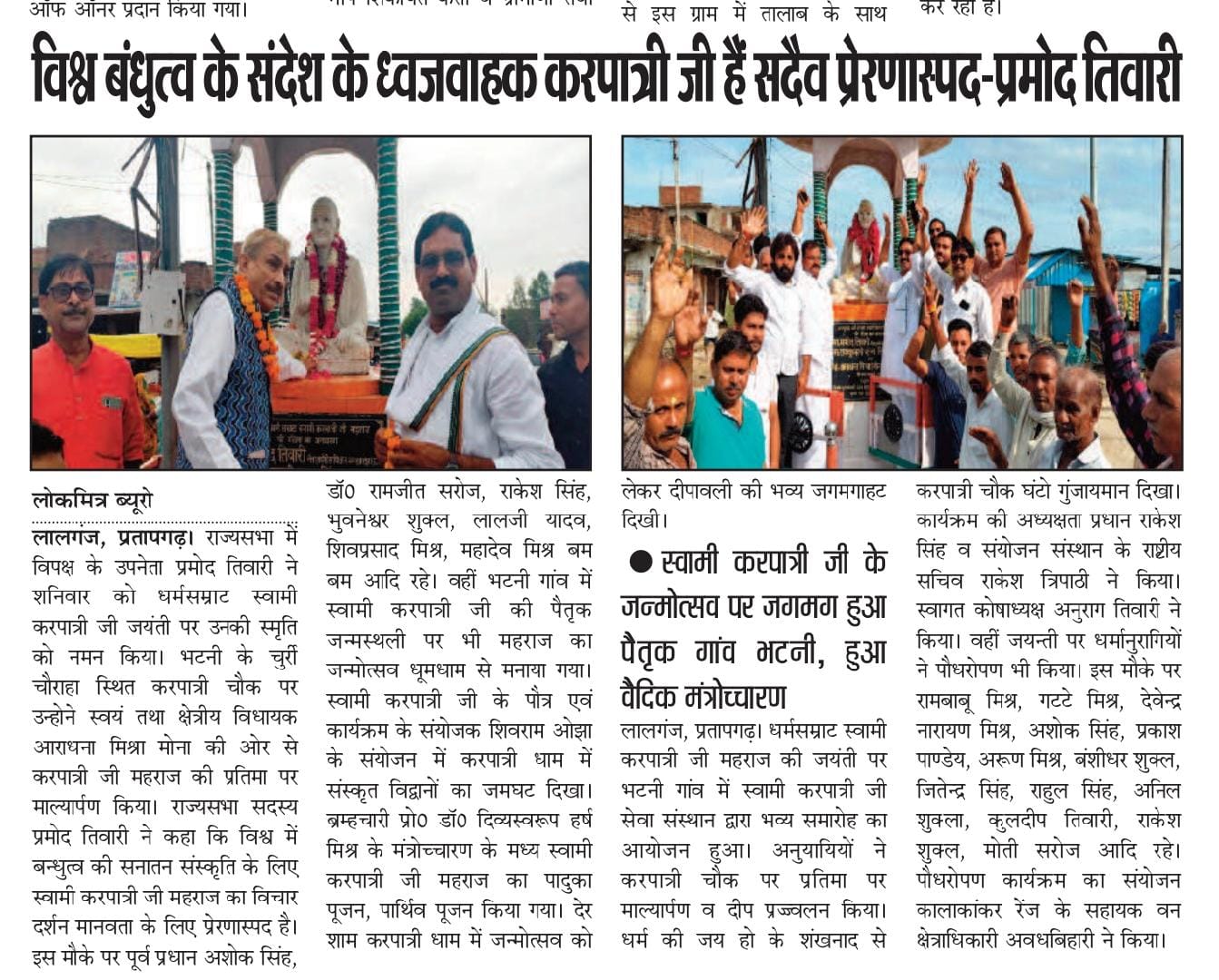 17 फरवरी 2026 को भागवत भूषण श्री देवव्रत जी महाराज को नौढिया कुंडा, प्रतापगढ़ में श्रीमद्भागवत कथा के दौरान स्वामी करपात्री जी का चित्र व अंगवस्त्र भेंट किया गया