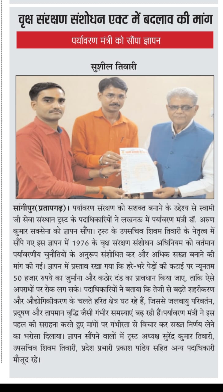 28 फरवरी 2026 को ट्रस्ट के राष्ट्रीय अध्यक्ष व उपसचिव ने पर्यावरण सेना प्रमुख का स्वामी जी का चित्र व अंगवस्त्र से सम्मान किया