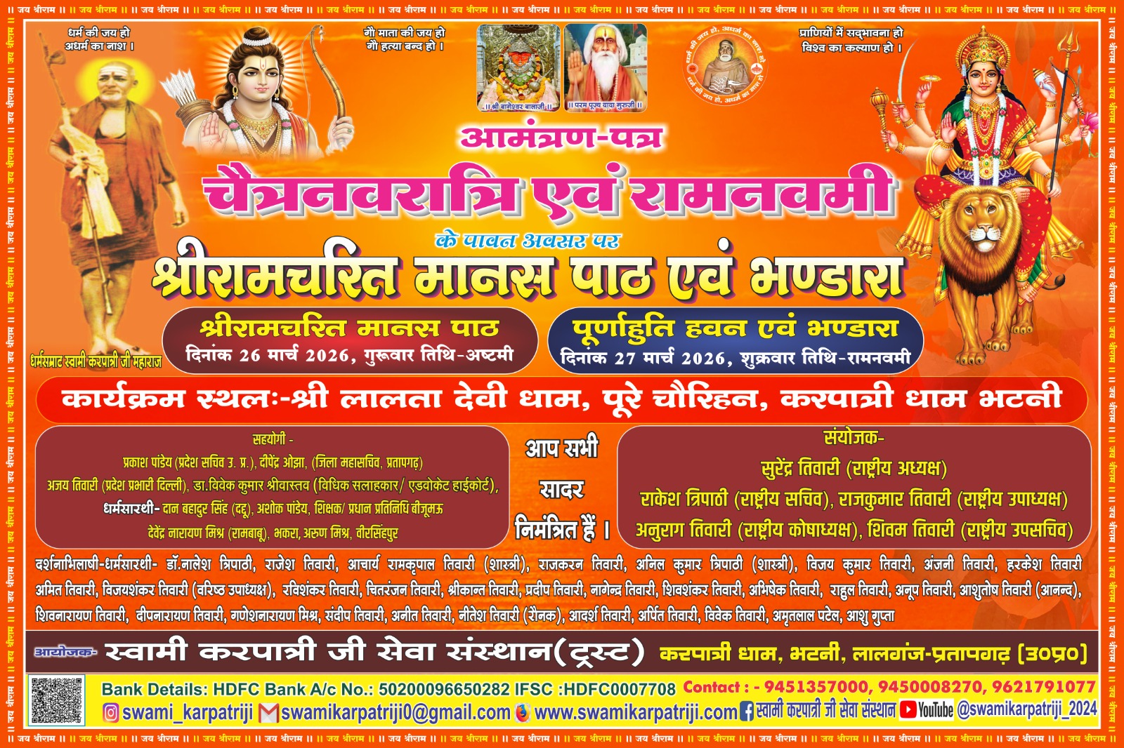 27 मार्च 2026 को श्रीरामचरितमानस पाठ 28 मार्च को कन्याभोज व भंडारा